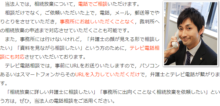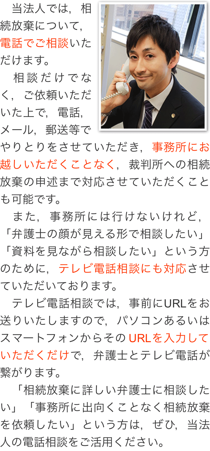 トップその他相続放棄の電話相談・テレビ電話相談 階層構造▼ その他(目次) 相続放棄の電話相談・テレビ電話相談 その他(目次)その他トップ共通バナー※消さない心グループニュース相続放棄の電話相談・テレビ電話相談弁護士費用(詳細)費用の安さにこだわる理由お客様相談室お役立ちリンク集関連リンク集プライバシーポリシー 受付時間 平日 9時~21時、土日祝 9時~18時 夜間・土日祝の相談も対応します (要予約) 所在地 〒286-0033 千葉県成田市花崎町801-1京阪成田ビル6F 0120-41-2403 お問合せ・アクセス・地図